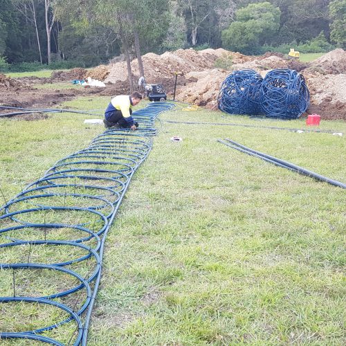 This incorporated horizontal ‘slinky’ ground loop geothermal system for energy efficient heating and cooling. Integration with the home’s solar PV/battery storage stand alone power system (with diesel back up), this completely off grid home is what we refer to as an Integrated Renewable Energy Power System.